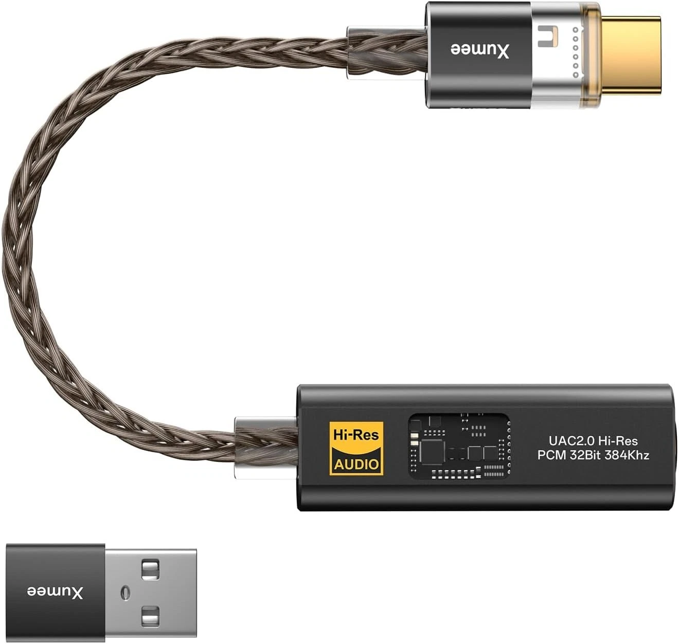 As you can see, it supports the insane frequency of 384 kHz at 32 bits. The adapter has a USB-C male adapter and includes a C-to-A adapter. It appears extremely well made, including braided cable and gold-plated connectors.